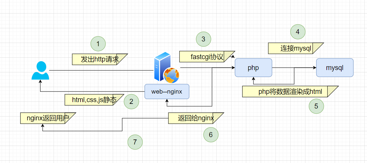 用户发出http请求,如果用户请求的是静态资源(html,css,js),nginx直接返回给用户,如果请求的是以.php结尾的动态请求,那么nginx通过fastcgi协议将请求传给php-fpm,php-fpm来调度php进程, php在处理请求的同时会根据代码来连接mysql,php拿到mysql返回的数据后,将数据渲染成html页面,返回给nginx,nginx将html页面返回给用户。